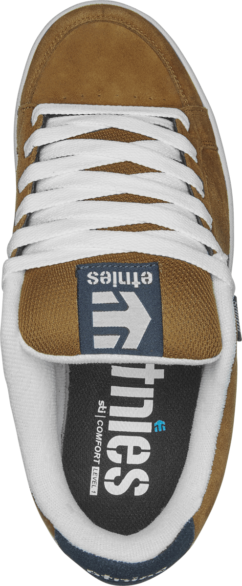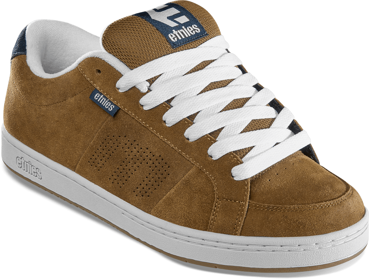 The Kingpin is a classic puffy-tongue skate shoe inspired by the earlier etnies Fader design. It sports a durable suede upper with perforated “E” logos on the side, a die-cut EVA insole and egg crate midsole for cushioning, and a 400 NBS rubber outsole for grip. With its generously padded tongue and collar, the Kingpin delivers retro styling and comfort while built to withstand daily skate abuse.
